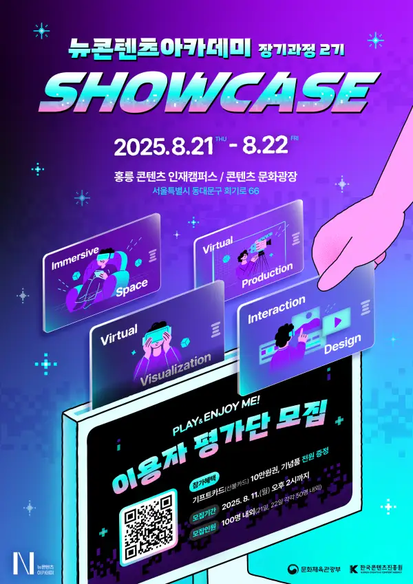 안녕하세요, 뉴콘텐츠아카데미 운영사무국입니다. 2025년 뉴콘텐츠아카데미 장기과정 2기 프로젝트 성과를 체험하고 즐길 수 있는 뉴콘텐츠아카데미 장기과정 2기 쇼케이스가 아래와 같이 개최됩니다. 더불어 신기술 융복합 콘텐츠의 대중성과 시장성을 검증하고, 실질적인 이용 ...
