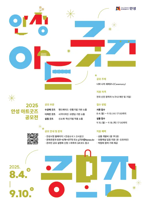 2025 안성 아트굿즈(AAG) 공모전 전국 신진 공예·디자인 창작자를 대상으로「2025 안성 아트굿즈 공모전」을 개최합니다. 선정된 창작자에게는 상품 개발비 총 1억 원, 스타필드 전시 및 판매, 온라인 유통 지원 등 실질적인 혜택을 제공합니다. 당신의 아이디어가 상 ...