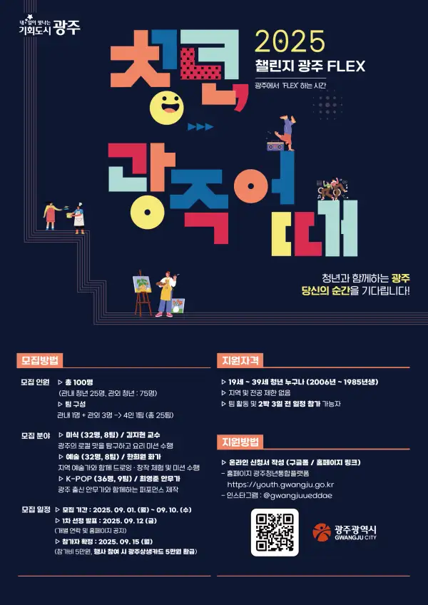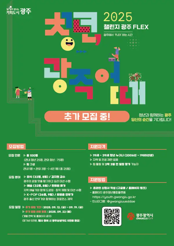 ○ 2025년 청년,광주 어때는 전국 청년들이 팀을 이뤄 광주에서 직접 체험하고, 창작하고, 도전하는 프로젝트입니다. 예술, 미식, K-POP 등 다양한 분야에서 광주의 매력을 FLEX해보세요! ○ 모집 일정 - 모집 기간 : 2025. 9. 1.(월) ~ 9. 10. ...