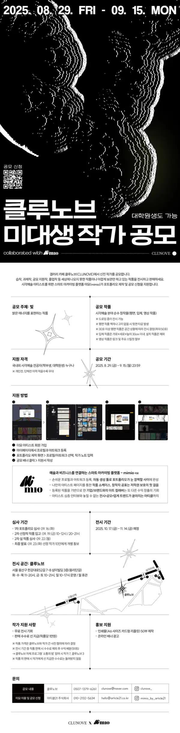 클루노브 미대생 작가 공모 collaborated with mimio 갤러리 카페 클루노브(CLUNOVE)에서 신진 작가를 공모합니다. 습작, 과제작, 공모 지원작, 졸업작 등 세상에 나오지 못한 혹은 잠시 나왔다가 보관 중인 작품을 전시하고 판매하세요. 시각예술 아티 ...