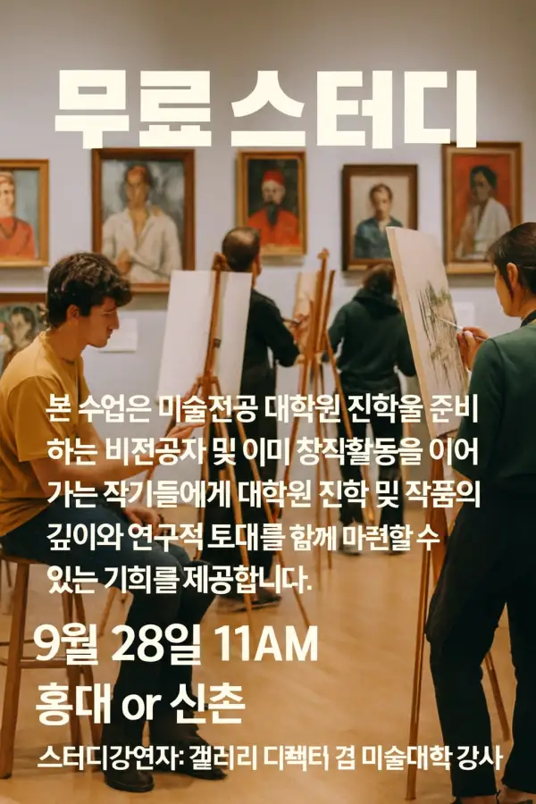 본 수업은 미술전공 대학원 진학을 준비하는 비전공자 및 이미 창작 활동을 이어가는 작가들에게 대학원 진학 및 작품의 깊이와 연구적 토대를 함께 마련할 수 있는 기회를 제공합니다. 수업내용 1- 대학원이라는 곳은 어떤 곳인가 ? 2- 포트폴리오 전략 3- 면 ...