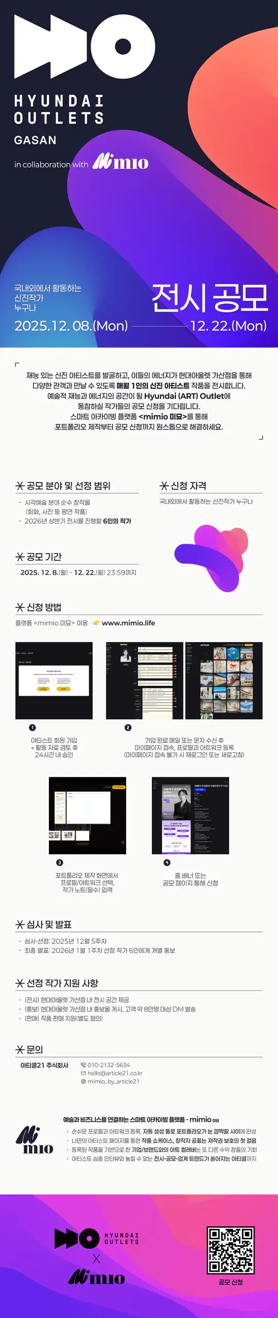 재능 있는 신진 아티스트를 발굴하고, 이들의 에너지가 현대아울렛 가산점을 통해 다양한 관객과 만날 수 있도록 매월 1인의 신진 아티스트 작품을 전시합니다. 예술적 재능과 에너지의 공간이 될 Hyundai (ART) Outlet에 동참하실 작가들의 공모 신청을 기다립니다 ...
