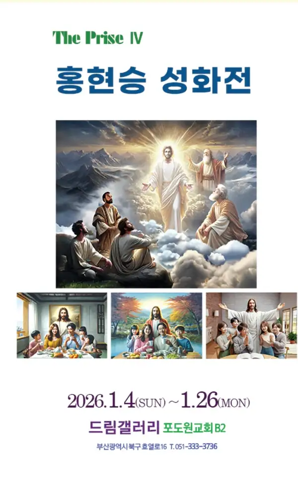 홍현승 제4회 성화전이 개최됩니다. 전시일정 : 2026년 1월 4일 ~ 1월 26일 전시장소 : 드림갤러리 부산포도원교회 B2 상설전시 : 새부산기독백화점 051-504-4880 작가 홈페이지 https://yabezhong.com