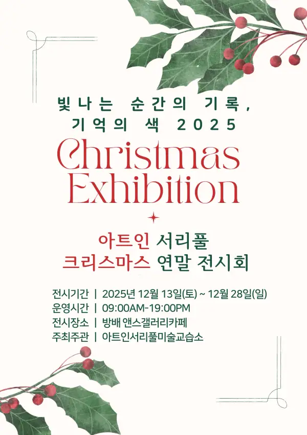빛나는 순간의 기록, 기억의 색 2025 <아트인서리풀 2025 크리스마스 연말 전시회> 한 해를 마무리하는 특별한 12월, 아트인서리풀미술교습소 아이들의 손끝에서 세상의 어떤 순간보다 반짝이는 ‘기억의 색’이 채워졌습니다. 이번 전시에는 6호 캔버스 위에 ...