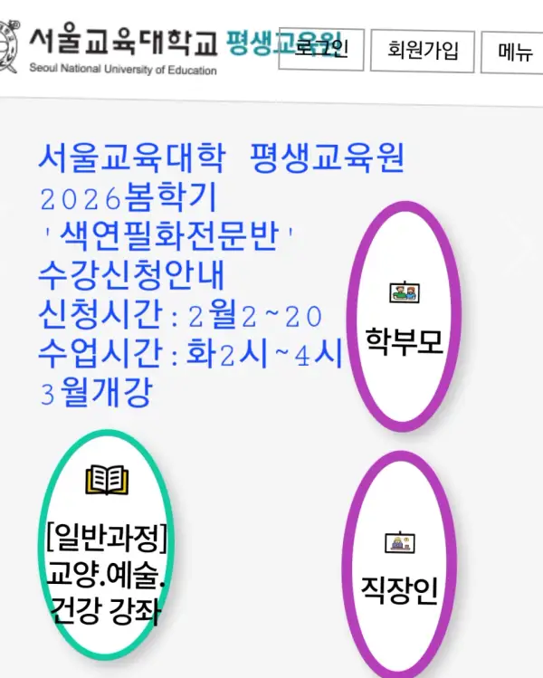 서울교대 평생교육원 색연필화 전문반 수강안내입니다 수강시 수료증 발급합니다 수강신청2월2~20 3월3일개강 화요일2시~4시 색연필화에 관심이 있고 전문적으로 배우고, 표현하고 싶으신 분에게 추천합니다 프로그램신청 | 서울교육대학교 평생교육원https://naver.me ...