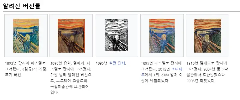 최초의 유화 작품은 오슬로 국립 미술관이 소장 중이며 파스텔/ 유화/ 석판 등 다양한 버전이 있어요!