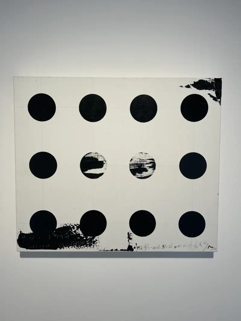 물감의 두께를 최대한 얇게 하고자 하는 등 화구를 최대한 아끼면서 작업하신다고 했는데, 그래서인지 첫 번째 작품의 가운데 두 원은 붓 자국이 그대로 남아있는 것을 볼 수 있어요. 묵으로 산수화를 그린 것처럼 드러나는 붓 자국이 신기하기도 했고, 또 계속 바라보다 보니 이유 모를 울림을 받기도 했어요.
