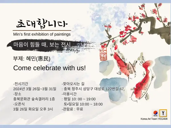 첫 개인전을 열게 되었어요. ✨초대합니다. ✨한국화 그림 전시회 : 마음이 힘들때 보는 전시 ✨일시: 2024.03.26.-03.31. ✨장소: 충북 청주시 숲속갤러리 1층