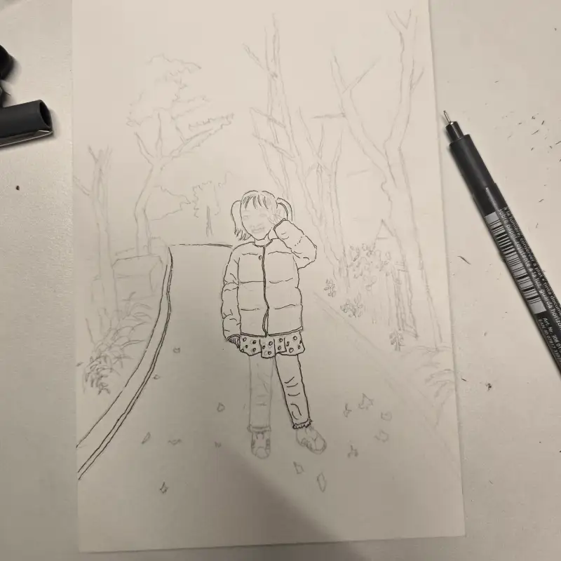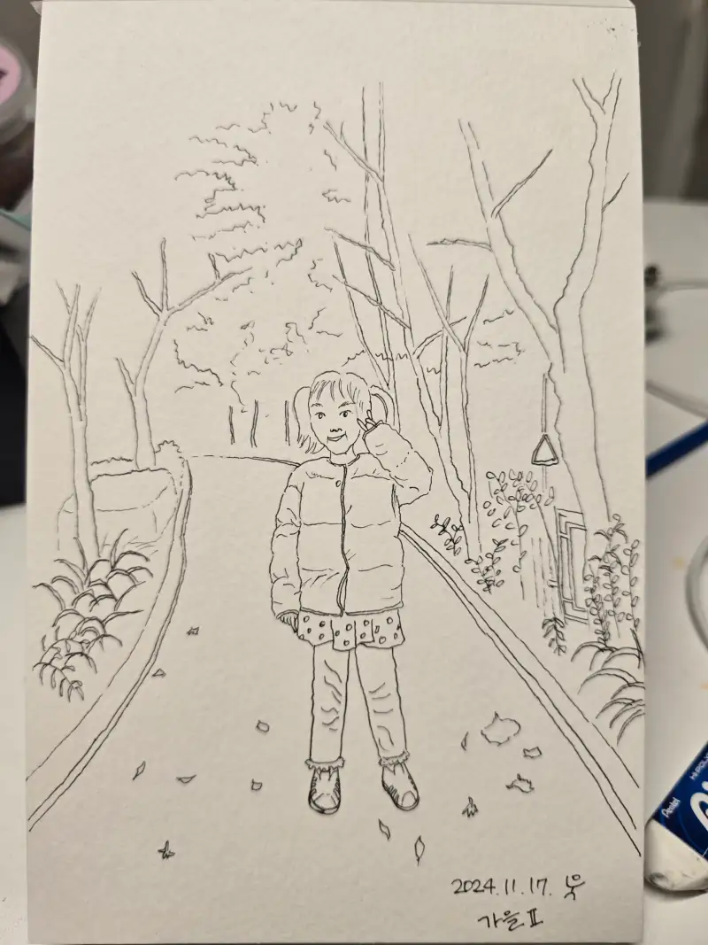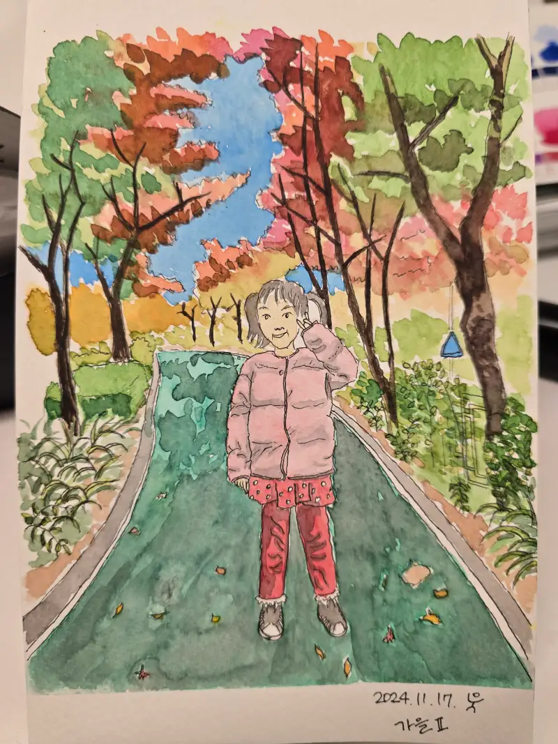 가을 2 사진이어서 파란 하늘에 아래 알록 달록 단풍나무 상 길에 서있는 우리 이쁜 아기를 그려보았다.
