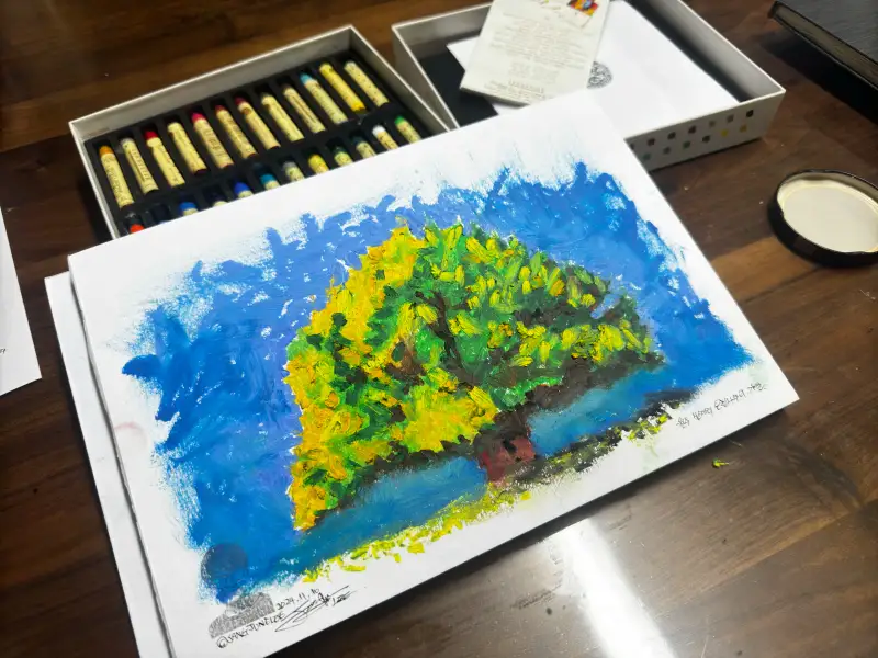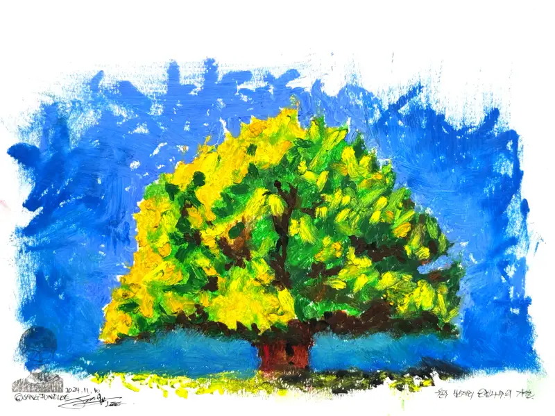 꾸덕 쫀득한 오일파스텔로 가을 초입의 은행나무를 그렸습니다