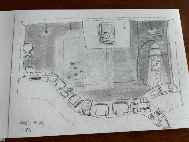이 공간의 중간에는 손님들의 고양이 사진을 프로젝터로 띄워주는 천이 달려 있는데 여기에 우리 집 냥이 둘도 사진이 전시되어 있다. 그래서 자꾸 자꾸 더 가게 되는 듯.