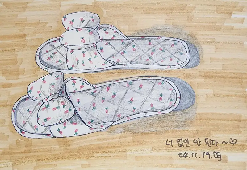 이번주 신발 주제로 뭘 그릴까? 생각하며 외출하고 집에 왔는데 현관에서 반기는듯한 실내화가 사랑스러워서 그려보았어요^^