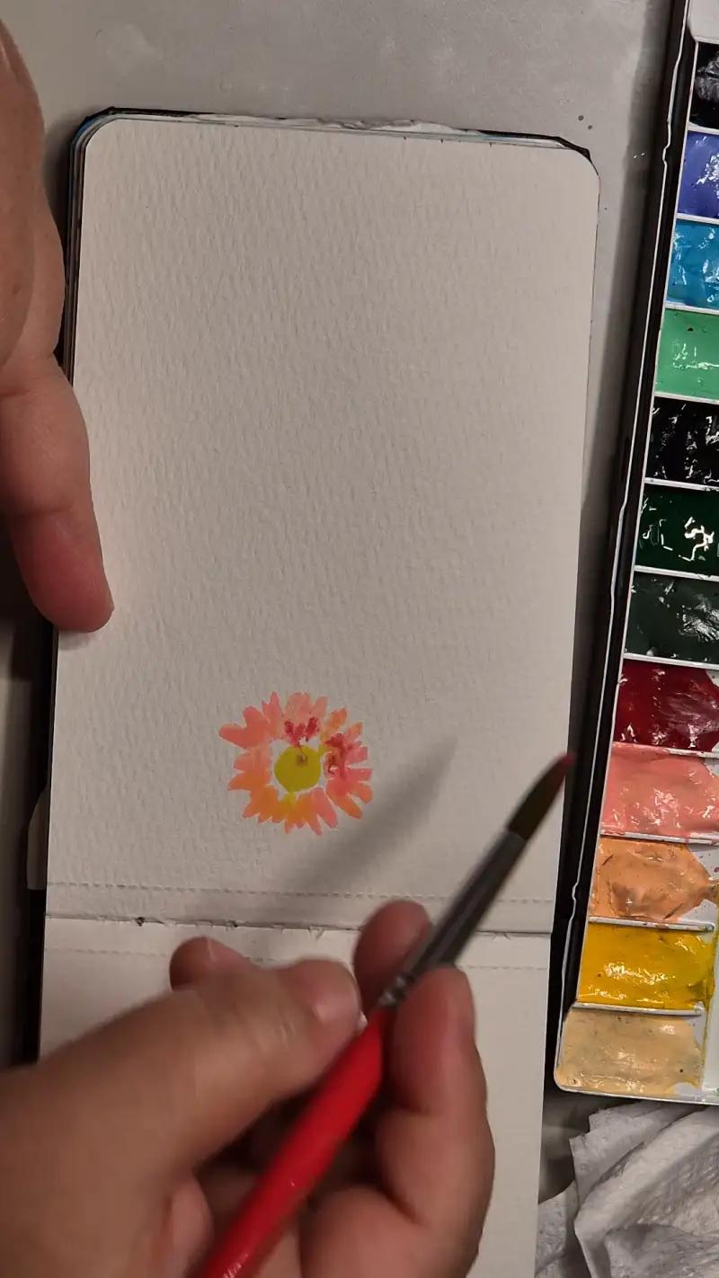 먼저 동그란 꽃 모양을 살려 꽃잎을 그리며 안쪽 노란 수술 부분을 그려 줍니다