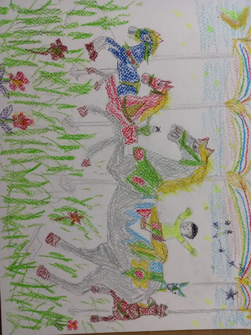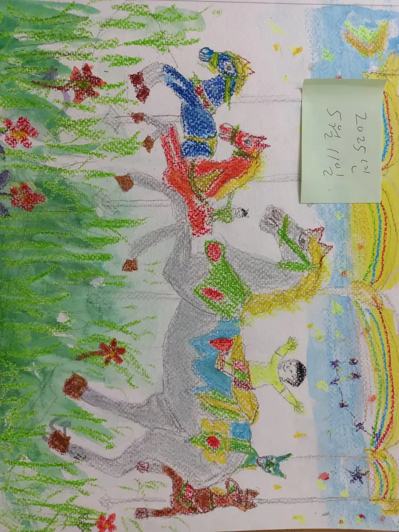 머리가 하얀 아이 말타고 달린다 빙빙 돌아간다.