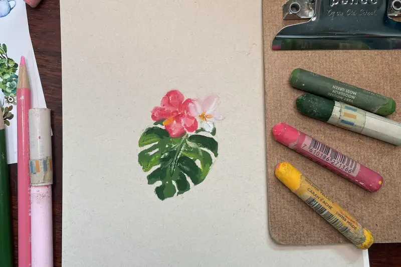 키우고싶은 몬스테라와 하와이에서 본 히비스커스 꽃을 그렸어요, 그림친구 앤님에게 선물받은 스티커북을 보고 그렸답니다 🌺