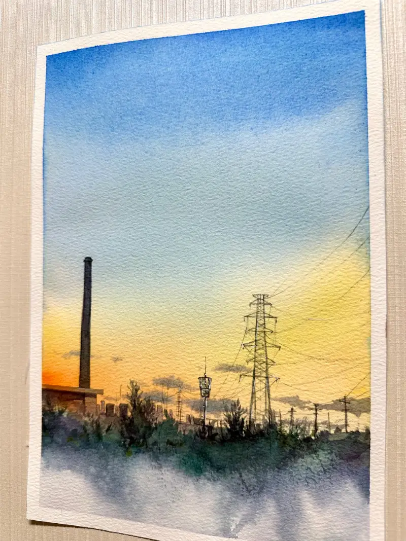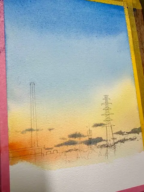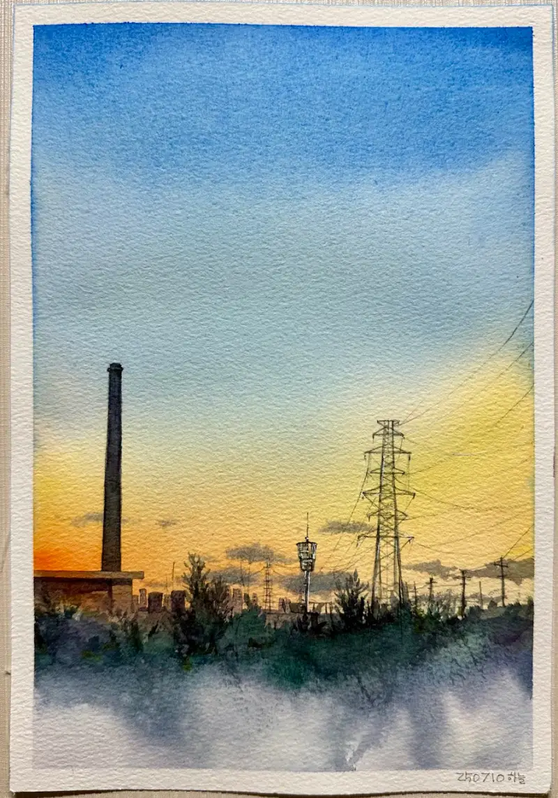 작년 가을쯤 강변을 거닐다 노을 바라보며 찍었던 하늘사진을 수채로 그려봤어요~