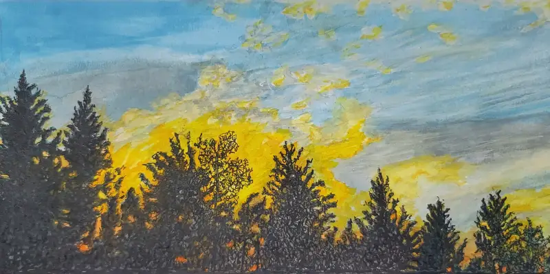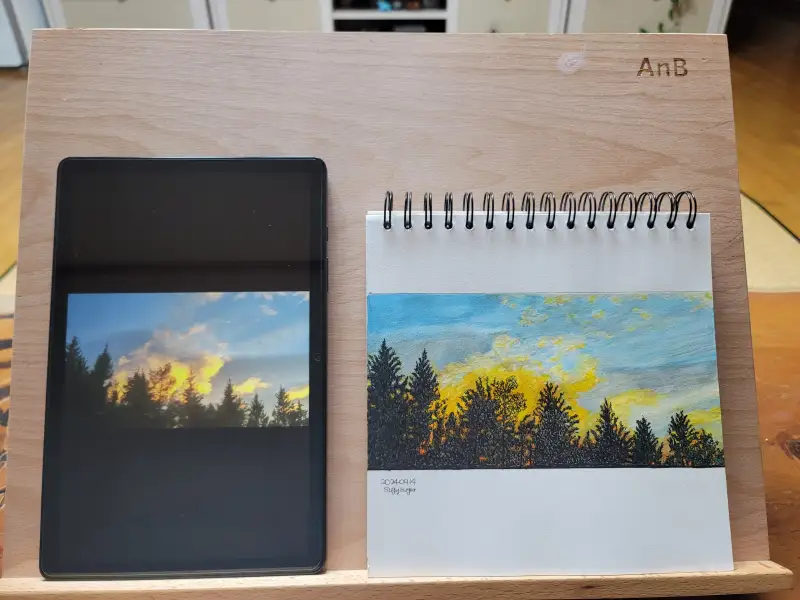 저녁 노을 사진은 달리는 버스의 차창 너머로 보이는 하늘이 넘 예뻐서 흔들림을 감수하고 찍었었던 기억이 있어요. 근데 지금 다시 보니 마치 나무들이 불길에 휩싸인 것처럼 보이네요. 그리고 이 챌린지를 참여하면서 과슈물감이 넘 궁금해서 미야 HIMI과슈수채물감을 주문했는데 마침 하늘을 채색하기 직전에 배송돼서 처음으로 써보게 됐는데...망했네요. ㅎㅎㅎ 시간을 두고 천천히 연습해 보려고요. 그리고 과슈 물감 전용지라는 게 있어서 같이 구입했는데 느낌이 참 좋았어요.