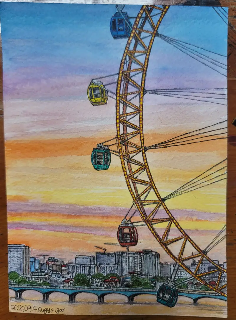 역시 노을을 배경으로 한 대관람차 그림은 핀터레스트에 있는 이미지 사진을 보고 그렸는데 혹시나하여 출처를 남깁니다.(출처:printerest@ Fijiyuri) 대관람차의 깨알같은 노랑 등을 그리다가 인내심의 한계를 겪어봤고요. 사쿠라 칼라 젤리펜을 넘넘 유용하게 썼네요.