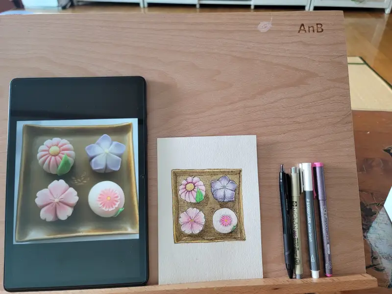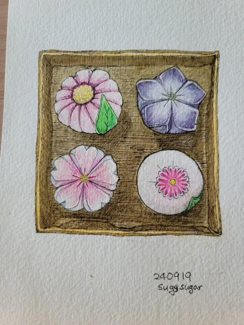 화과자는 늘 넘 예뻐서 먹어버리기가 아까웠던 것 같다. 화과자를 그리면서 자연스레 화과자 장인들이 주인공인 순정만화 ' 우리들은 미쳤다(안도미 나츠)'가 저절로 떠올랐다. 화과자 만드는 과정이 자세하게 그려져 있어 재미있게 봤었는데... 특히나 펜드로잉을 한 후에 채색하다보니 역시 표면의 질감 표현이 쉽지는 않은 것 같다.