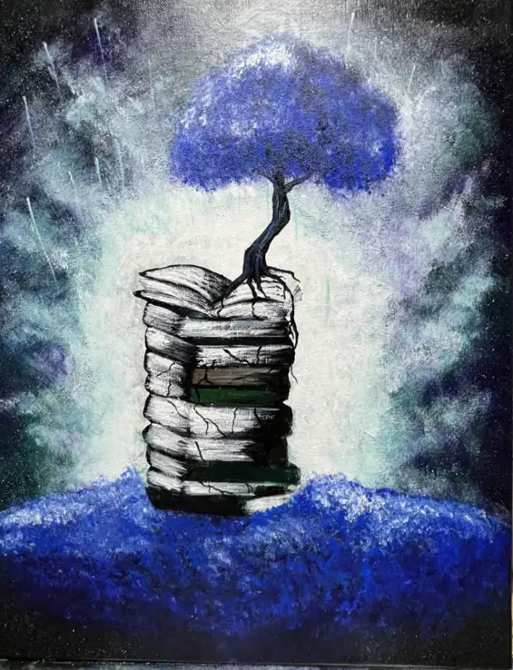 아크릴화로 책과 파란신비로운 나무를 표현했습니다.