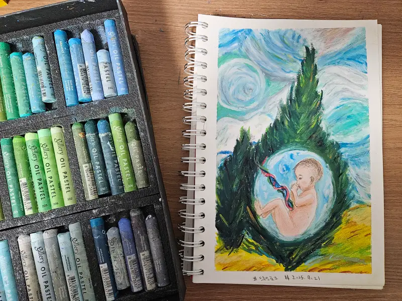 아들이 삼나무처럼 튼튼하게 자라길 바라면서 문교 오일 파스텔로 그렸습니다.