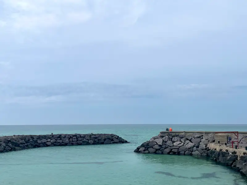 에매랄드 빛 바다와 방파제에 앉아있는 사람의 모습이 인상적이었던 장면을 그려봤어요 🩵🤍