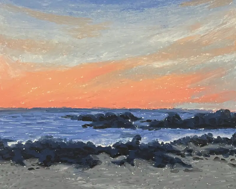 조그맣게 보이던 비행기가 인상적이었던 날. 분홍색과 파란색이 섞인 하늘이 예뻤는데 제가 가진 오일파스텔에는 비슷한 색이 없어서 아쉬워요 🧡💙