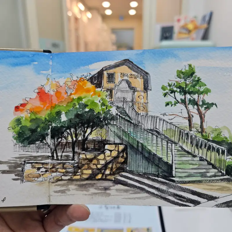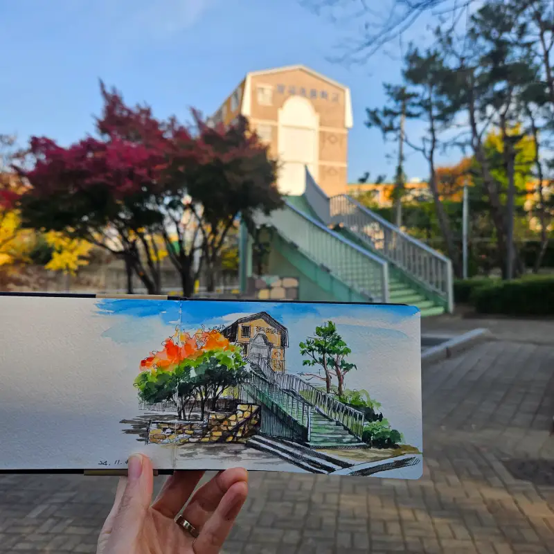 어반스케치를 하고싶었는데 생각만큼 행동으로 이어지지 않아서 처음으로 드로잉로그를 시작해봅니다 집에서 가까운 공원에서 그렸어요~점점 실력이 늘기를 기대해봅니다