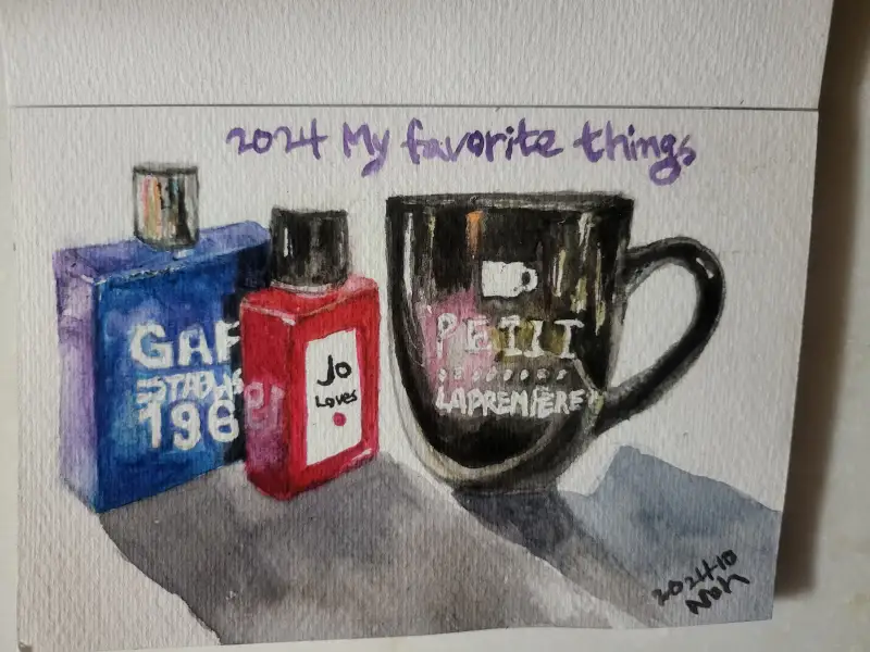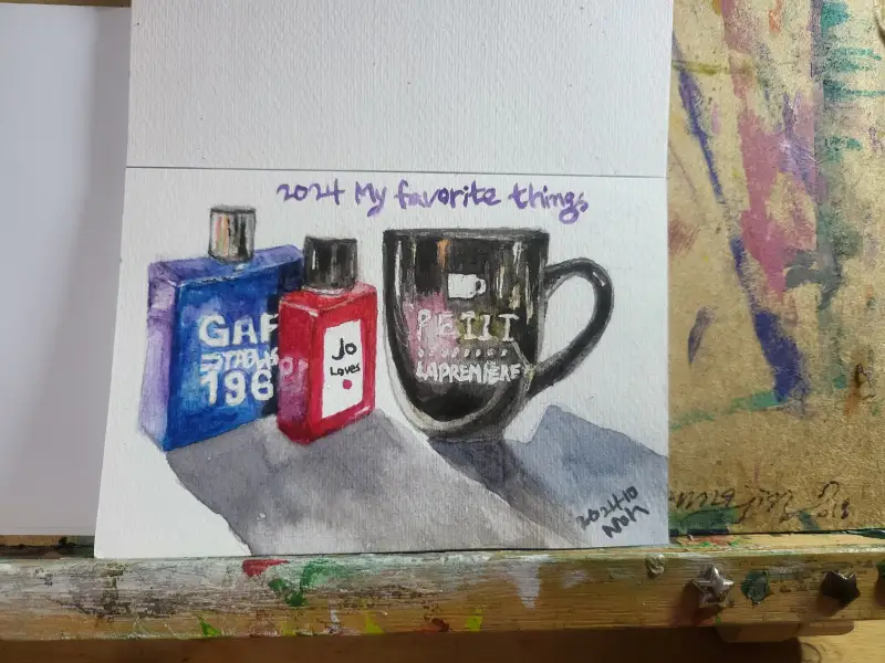 올해 애용하고 있는 컵과 향수들 중 마음에 드는 색깔의 것들을 모아 그려봤다.