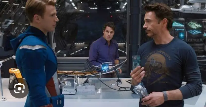 이번 주제를 보고 그리고자 한 장면의 원본 (사진 출처: 어벤져스 (2012)) 입니다. 뒤에 브루스 배너 (헐크), 자잘한 물건들은 생략하고 중요 인물인 캡틴과 토니만 자세히 그려두고 배경은 바로 전에 그린 작품처럼 두리뭉실하게 표현하였습니다.