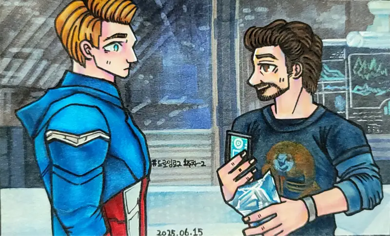 안녕하세요 marvelucat 입니다. 원래 과일 주제를 보고 사과와 관련된 여러 아이디어가 떠올라 사과를 그리려 했으나, 갑작스레 어벤져스 1편에서 토니 스타크 (아이언맨) 이 스티브 로저스 (캡틴아메리카) 에게 블루베리를 권하는 장면이 떠올라 그 장면을 그려보기로 결정했습니다.