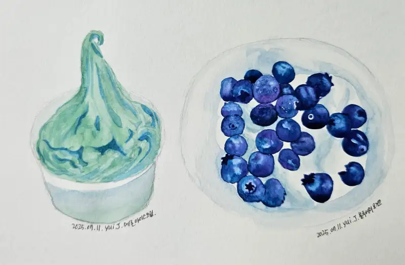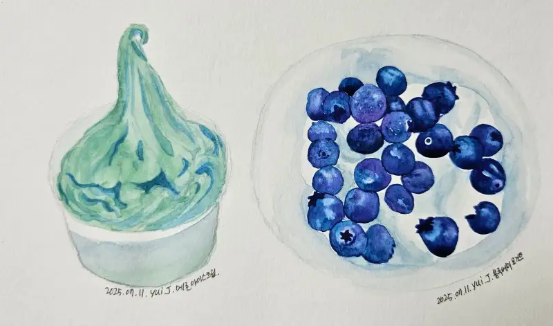 최근에 기억에 남는 디저트가 없어서 사진첩을 뒤지다가 언젠가 먹은 '메론 아이스크림' , '블루베리 요거트' 가 보여서 그려봤습니다.