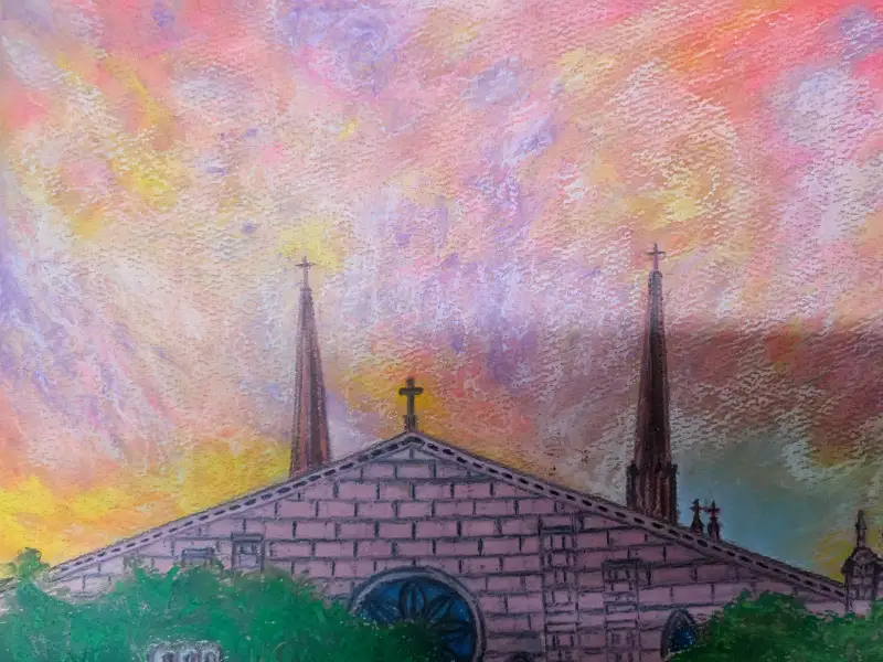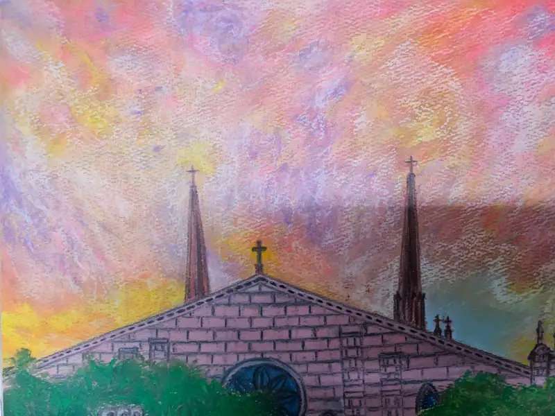 여름 성당뒤로 노을진 하늘 풍경