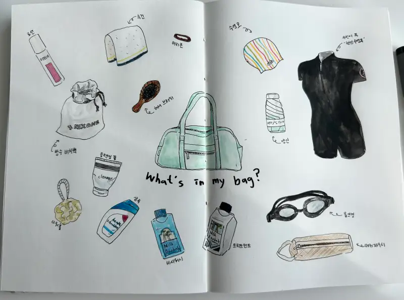 정말 제 수영가방 안 그대로를 그려보았습니다!! 열심히 다녀서 접영까지 가능한 그날까지 화이팅🌟