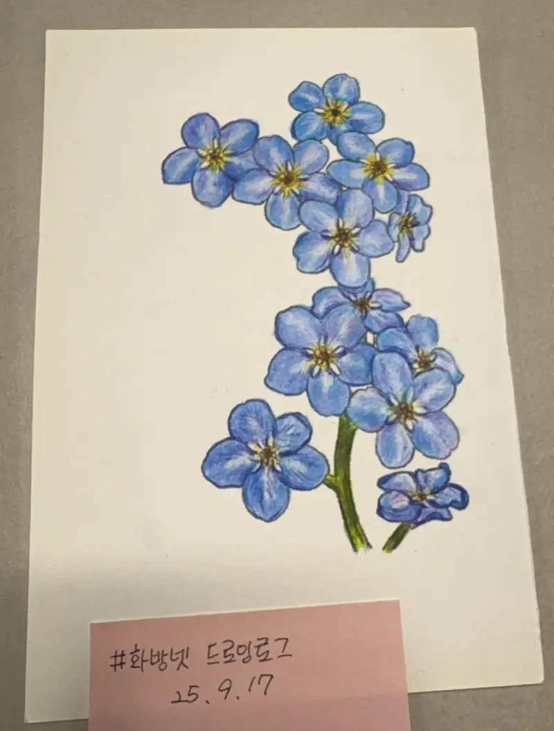 아이의 5월의 탄생화인 물망초를 프리즈마 유성 색연필 72색으로 그렸습니다. 아직 초등생인 아이가 거의 다 그리고 저는 마지막에 조금 도와서 함께 그렸습니다.