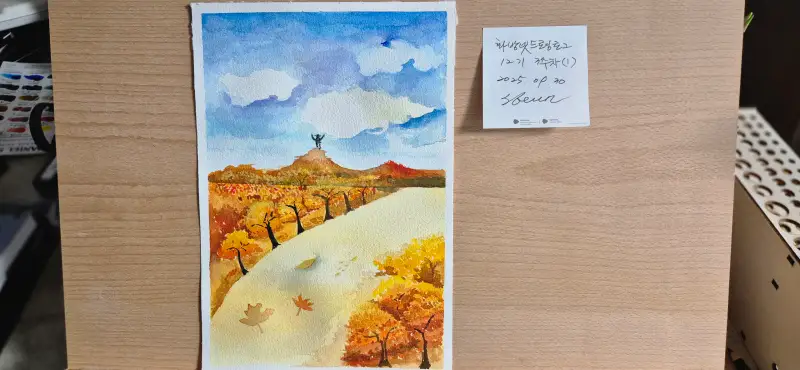 사실 전 등산을 매우 안 좋아합니다. 어릴 적 부모님의 손에 동생과 끌려다니다시피(?) 다녀서 산에서 찍은 사진 보면 하나같이 입이 대발 나오고 찡그린 거 밖에는 없습니다. 근데 이번 주제가 역설적이게도 등산이네요. 그래서 등산을 제가 이루고자하는 목표와 과정에 빗대어 그려 봤습니다. 상상해서 그리자니 어려웠는데요. 그래도 과정은 재밌었어요~ 요즘은 팔레트에 물감 짜는 것과 수채화로 작업하는 재미에 빠졌답니다~
