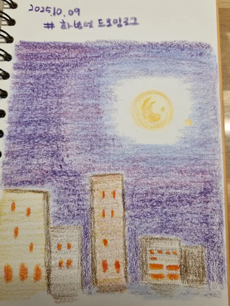 색연필로 그린 어두운 밤에 뜬 밝은 보름달~
