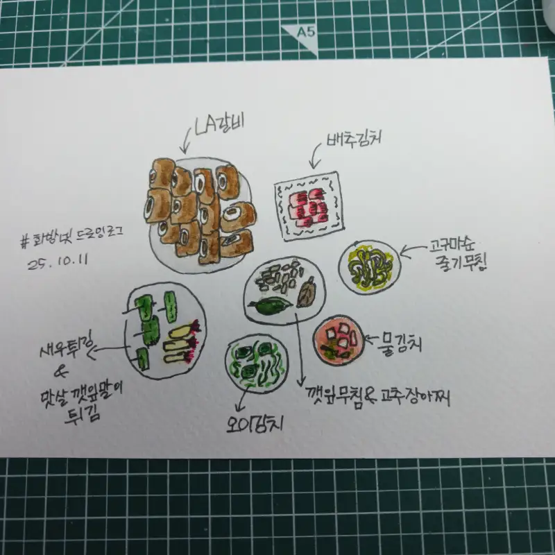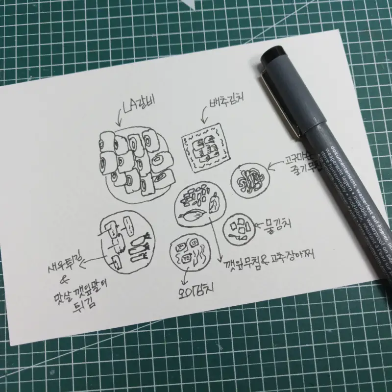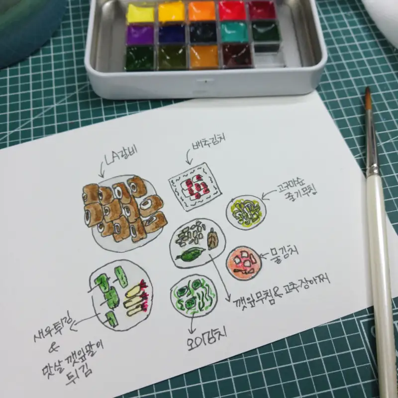 LA갈비,배추김치,물김치,오이김치,깻잎장아찌 두 종류(고추장,된장)와 고추장아찌 두 종류(고추장,된장), 새우튀김, 맛살깻잎말이 튀김,고구마줄기볶음 등등 그릴수 있는것만 그려보았습니다