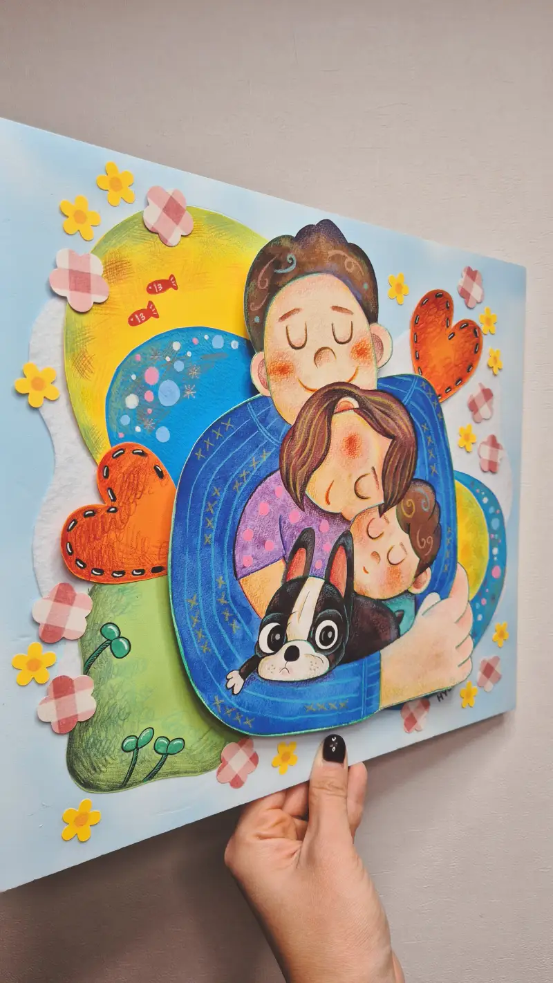 아빠가 온가족을 다 품어주고 있는 따뜻한 일러스트를 그려보았고, 주제부를 눈에 띄게 해주고 싶어서 배경은 색종이로 꾸며주고 그림 그린건 오려서 입체로 붙여주었어요.