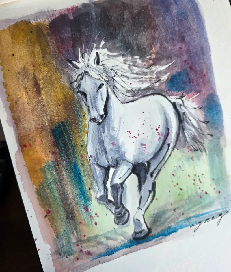 붉은 말을 그리고 싶었지만 어려워서 달리는 흰말로 대신