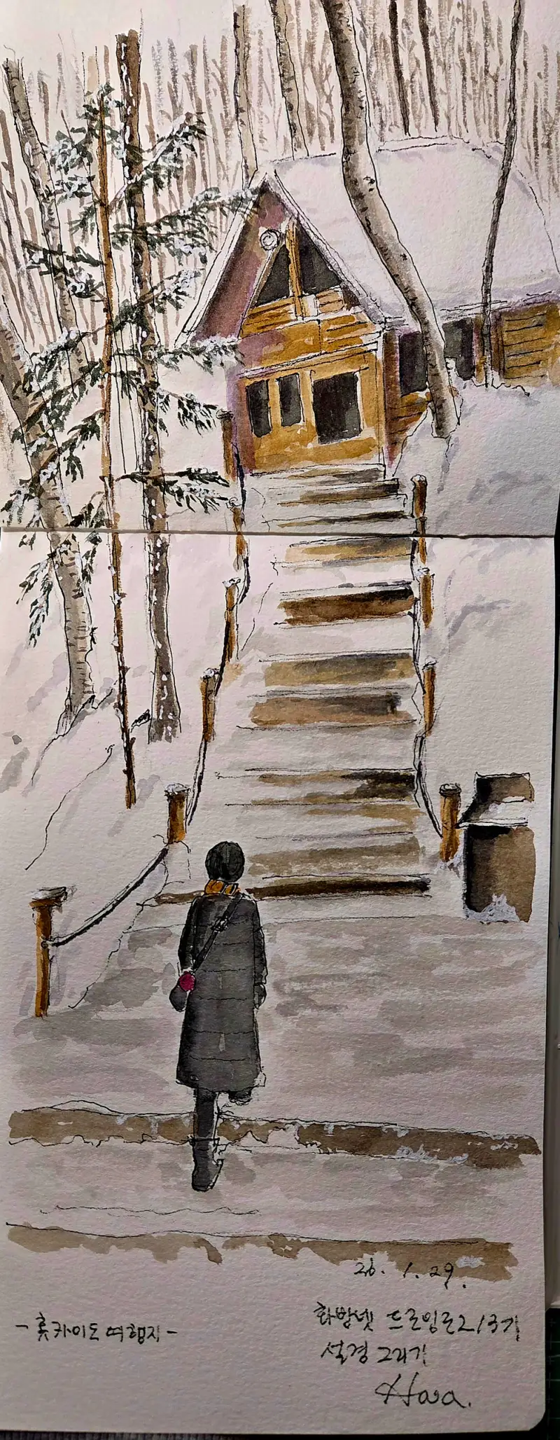 아기자기한 산장길을 뽀드득뽀드득 눈길을 걸으며 다녔던 기억을 되살리며 그렸습니다.