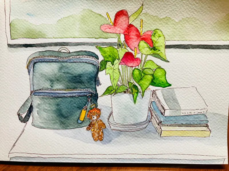안시리움 화분과 나란히 앉아