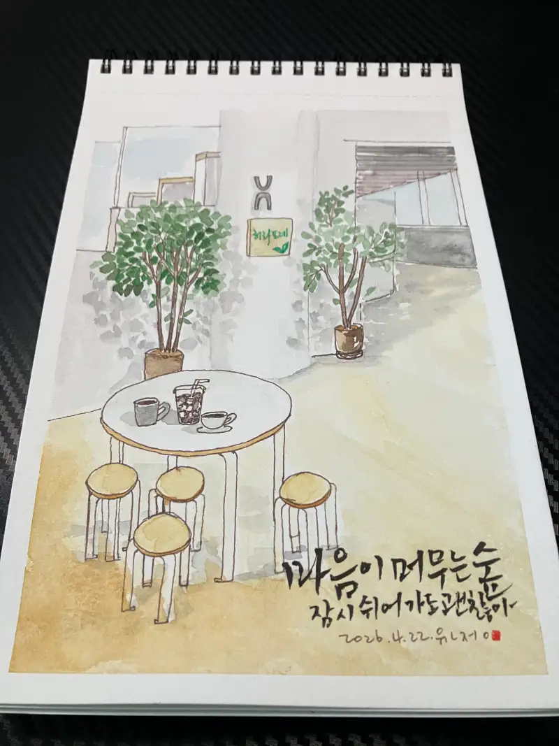 퇴근 길 사람들이 가고 한적한 카페를 붓에 담아낸다.