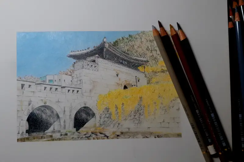 파버카스텔폴리크로모스,화방넷드로잉로그,지금의풍경,홍지문과개나리