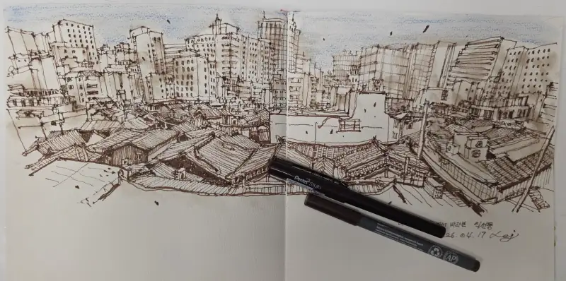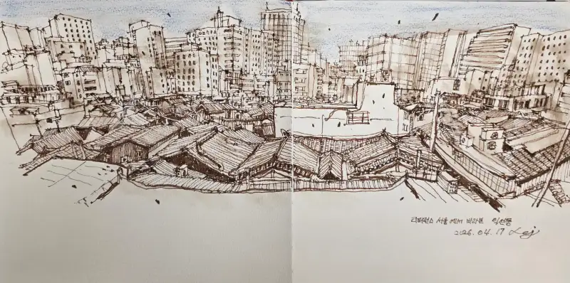 촤~악 펼쳐진 기와지붕과 빌딩숲에 매혹되어 살짝 흥분되어 빨리 펜을 들고 멋지게 양장북에 옮기고 싶은 마음은 굴뚝같았지만....