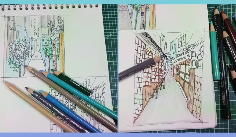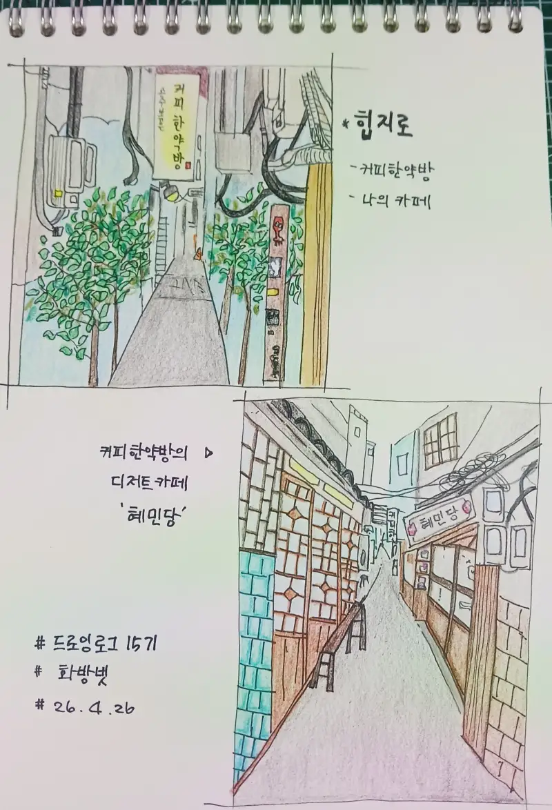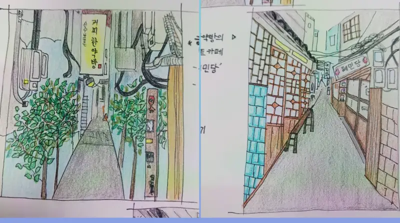 혜민당쪽에서 커피한약방 쪽으로 바라보는 모습 두 군데를 그렸어요