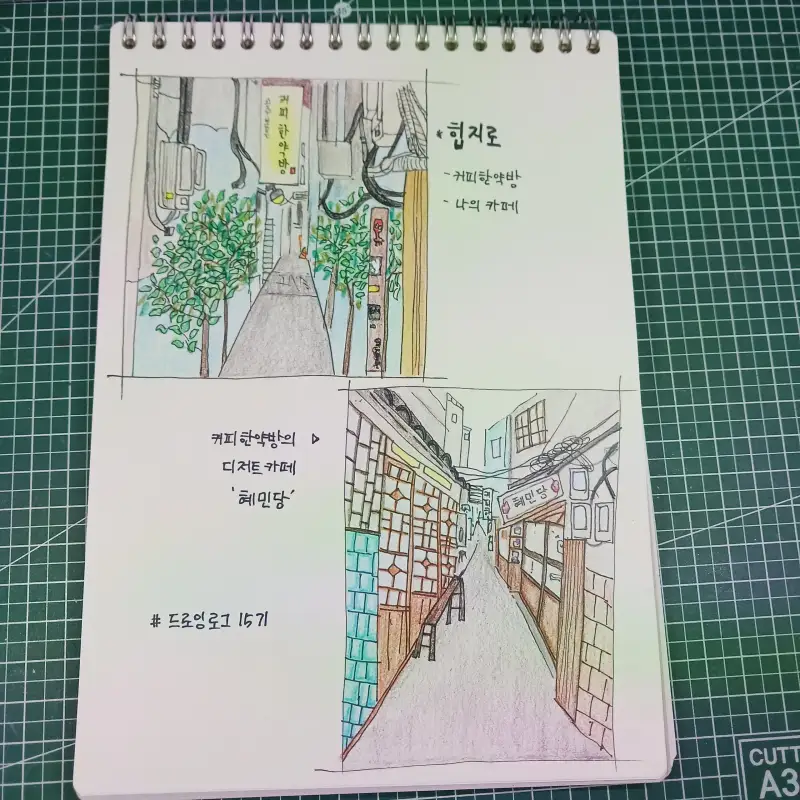 오래전 긴 서울 생활할때 을지로에 카페 오픈한 친한 배우 언니네 부부의 커피숍이 곧 도시정비형 재개발로 건물 ㅈ덜거 예정이라는 기사를 보고 맘이 아파 나의 지난 추억을 기록으로 남기고자 실력도 없는 나의 드로잉을 시작합니다