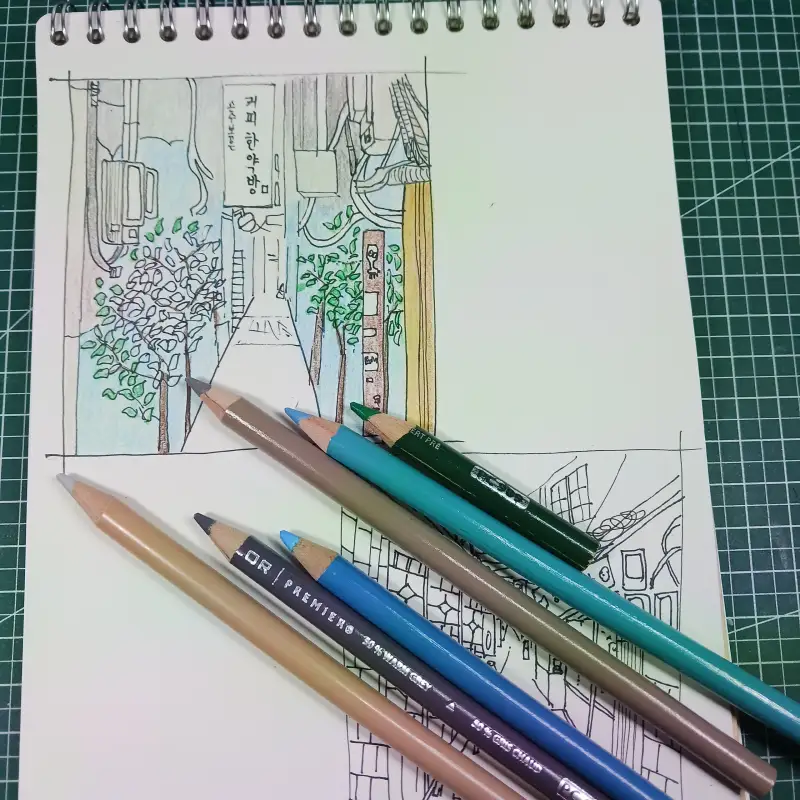 물감으로 칠하려다 어깨 깡패들은 들어가지도 못하는 좁은 골목의 빈티지 벽화 느낌을 살리고 싶어 색연필로 칠합니다.