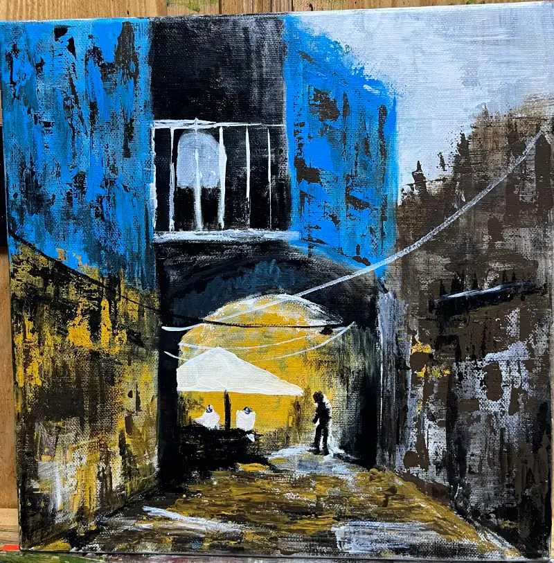 아크릴물감을사용한 아크릴화로 붓과 나이프를사용하여 건물의 올드함 을 표현.