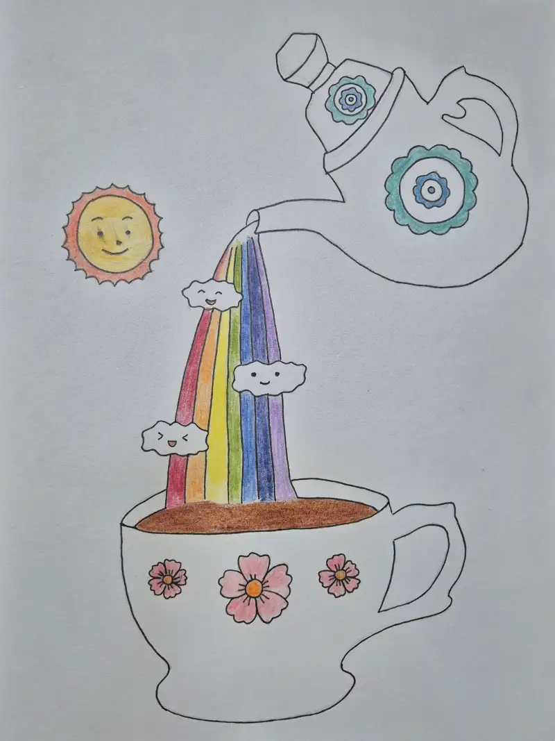 드로잉로그,화방넷드로잉로그,커피,머그컵,무지개,햇님,구름,파버카스텔,수채색연필,60색